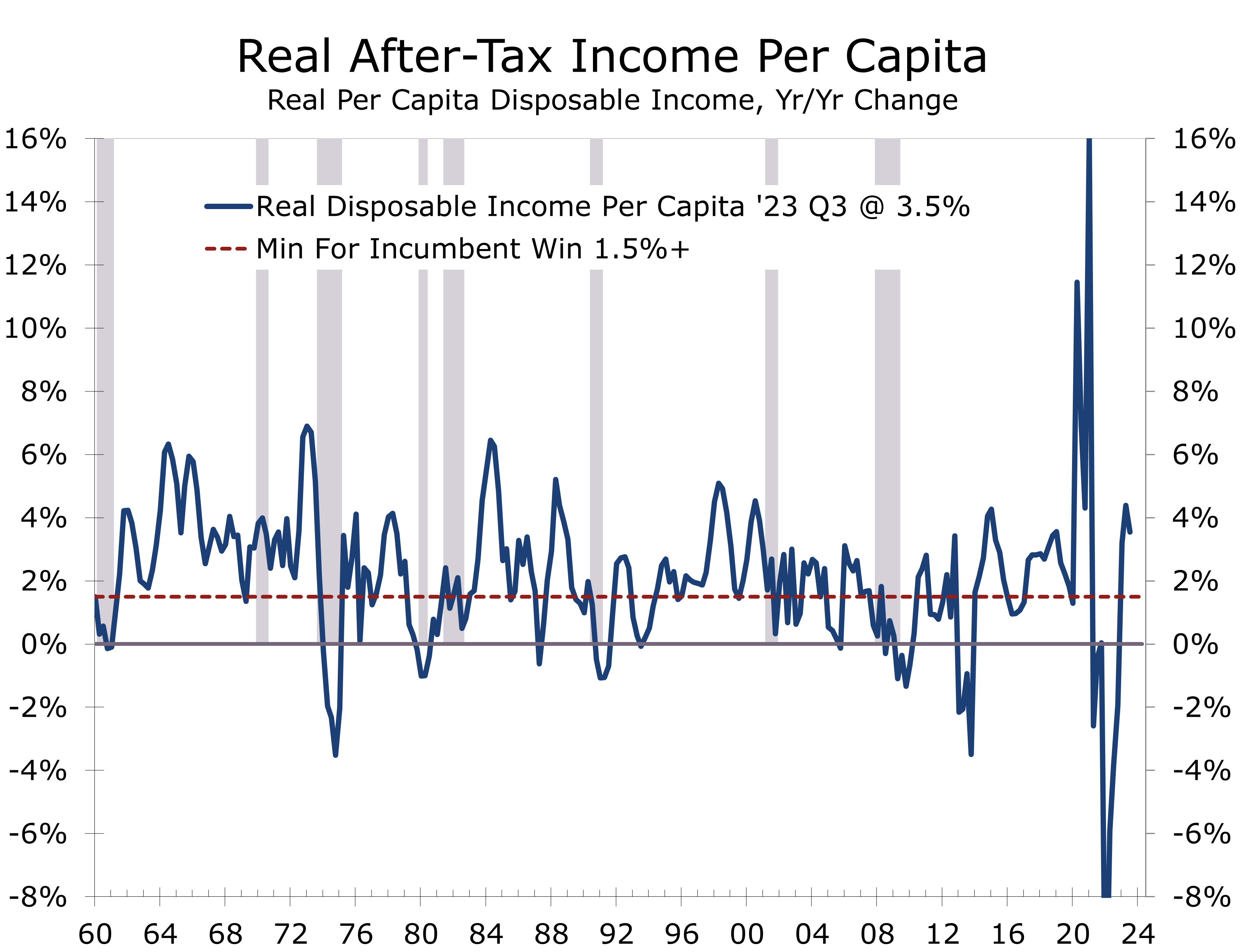 Another reliable measure of economic well-being that has correctly predicted the outcome of 10 of the past 16 presidential elections since 1960 is real after-tax income per person, which is also sometimes referred to as take-home pay minus inflation. The critical level in real per capita disposable income growth is 1.5% in the year preceding the presidential election. When take-home pay per person, minus inflation, rises by 1.5% or more in the year leading up to the presidential election, the incumbent or the person representing the party currently occupying the White House is almost always reelected.