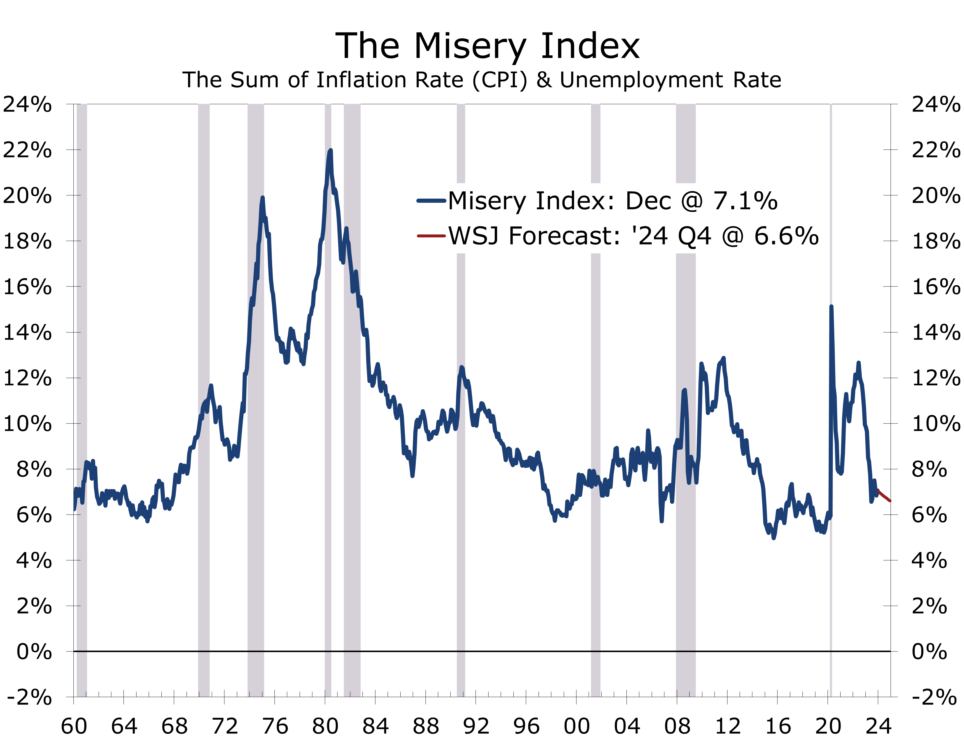 One of the most popular measures of economic well-being during election years is the Misery Index. The Misery Index, created by economist Arthur Okun, is a simple measure that combines the inflation rate and unemployment rate to gauge the overall economic well-being of a country. Okun, who was an economic advisor to President Kennedy, introduced the concept in the 1960s to provide a straightforward assessment of the economic conditions affecting the average citizen. The index is calculated by adding the inflation rate, calculated from the 12-month change in the CPI, to the unemployment rate, providing a quick synopsis of economic conditions that is easy to compare over time.