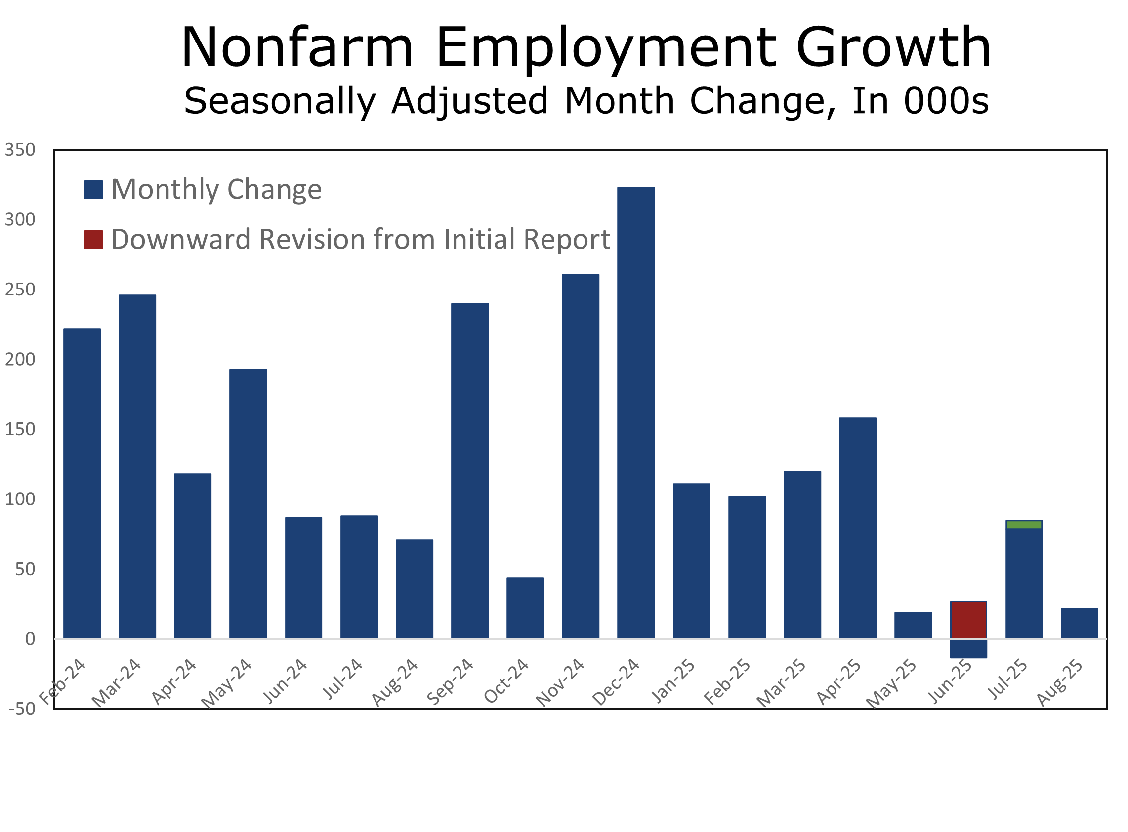 - Nonfarm payrolls rose just 22,000 in August, with downward revisions subtracting 21,000 from prior months. Job growth has averaged only 29,000 over the past three months.