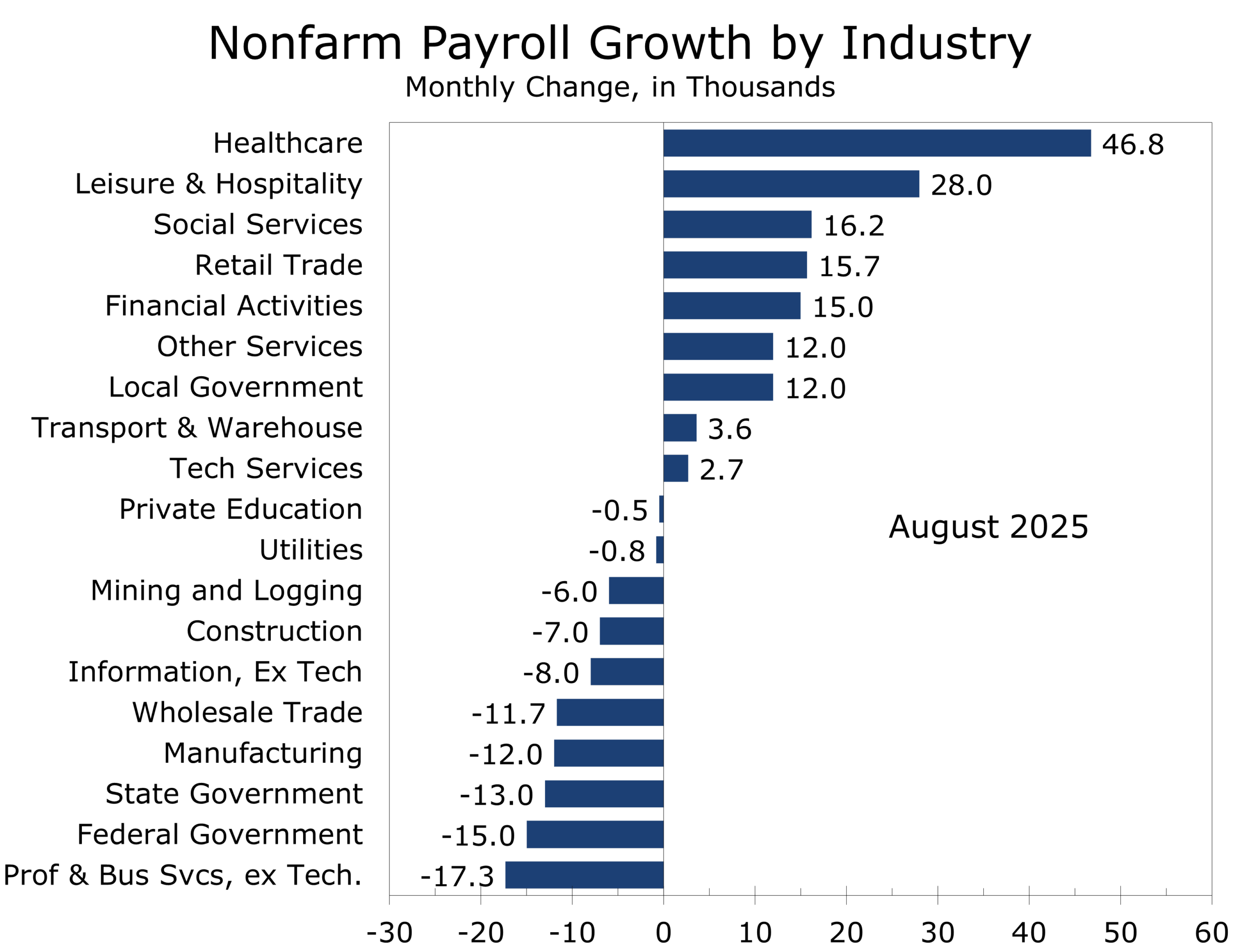 White-collar employment remains soft. Tech-related jobs Hiring also rebounded slightly in technology services, adding 2,700 jobs in August. The gain follows a long string of declines and hiring has been sluggish amidst to rollout and continuous improvement of various AI platforms. Professional and business services show no momentum, as firms curb use of consultants in response to AI-driven productivity, tighter budgets, and slower final demand.