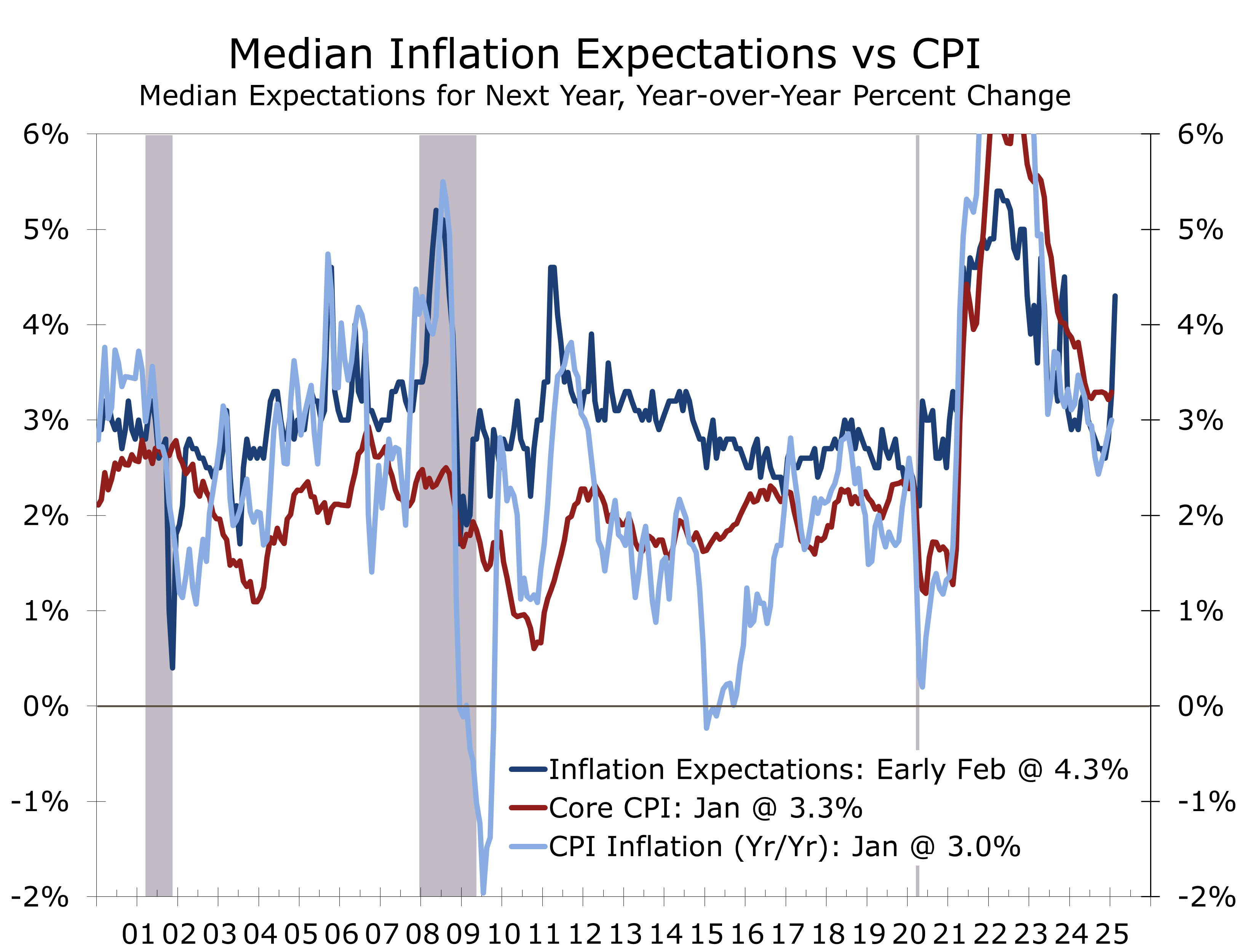 Shelter costs continued to be a significant contributor to inflation, rising 0.4% and accounting for nearly 30% of the overall CPI increase. Energy prices also moved higher, with the index rising 1.1% in January, driven by a 1.8% jump in gasoline prices. Food prices rose 0.4%, with food at home up 0.5% and food away from home increasing 0.2%. The sharp rise in grocery and fuel costs aligns with the uptick in near-term inflation expectations seen in the University of Michigan’s Consumer Sentiment Survey.