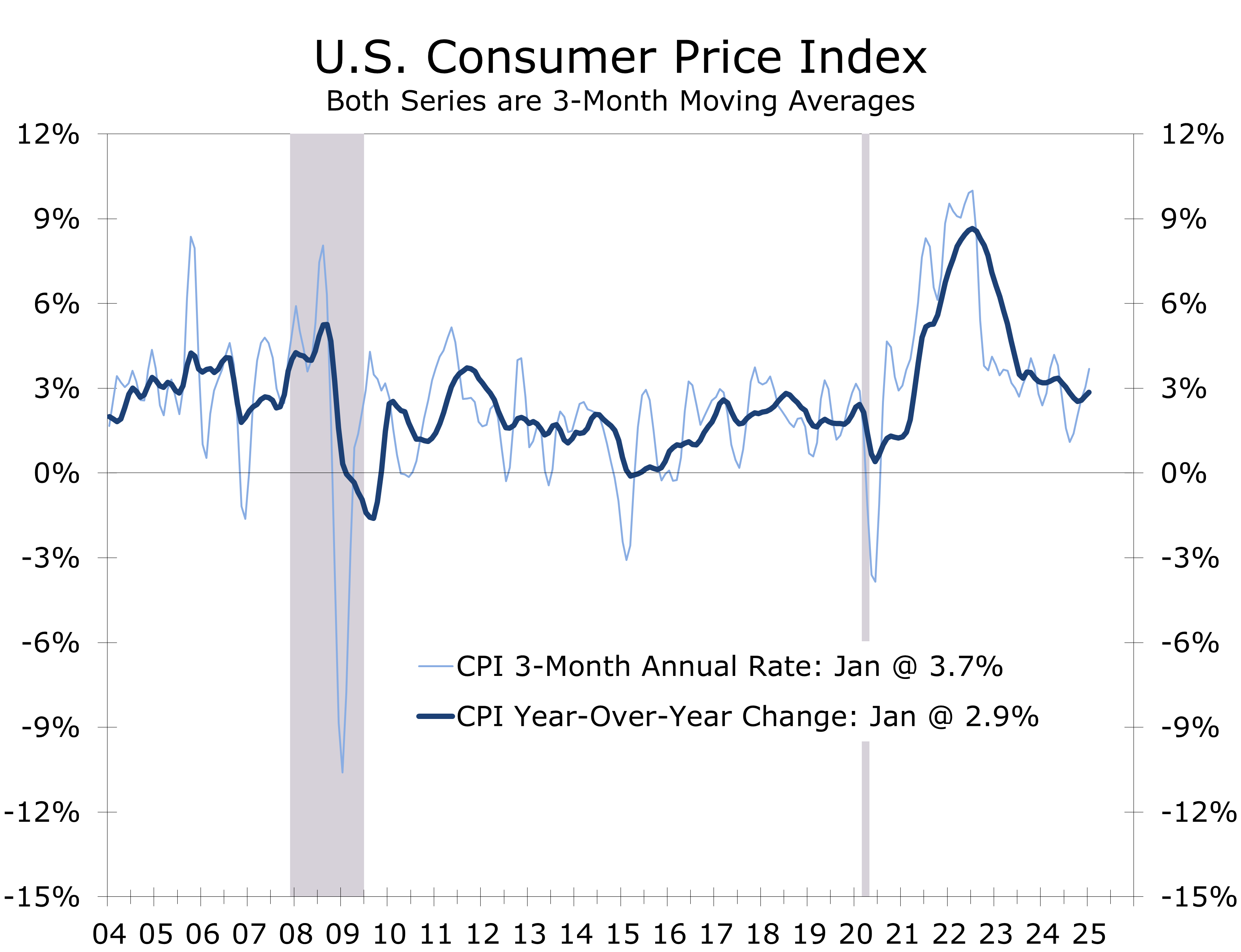 The January Consumer Price Index (CPI) report showed inflation running slightly hotter than expected, with the headline CPI rising 0.5%, following a 0.4% increase in December. Over the past three months, the CPI has increased at an annualized rate of 3.7%, and on a year-over-year basis, inflation remains at 3.0%. The core CPI, which excludes food and energy, rose 0.4% in January and 3.3% over the past year, reflecting persistent price pressures in key service categories.