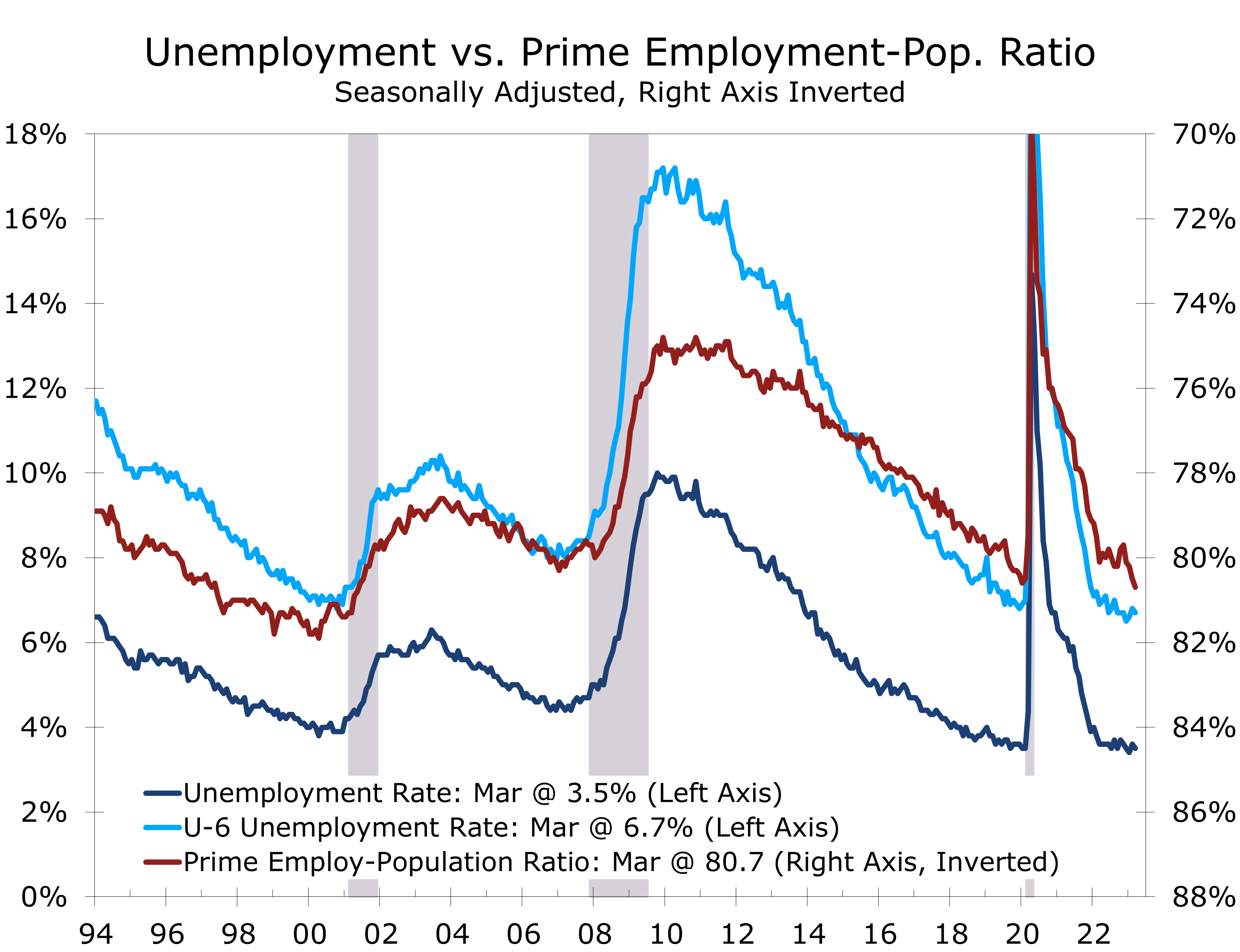 The unemployment rate fell 0.1 point to 3.5% in March, as household employment rose by 577,000, outpacing a 480,000 rise in the civilian labor force. The labor force participation rate and prime employment population rate both rose in March, rising to their highest levels since the pandemic. The prime employment-population ratio rose 0.2 points to 80.7 and is now slightly higher than before the pandemic.