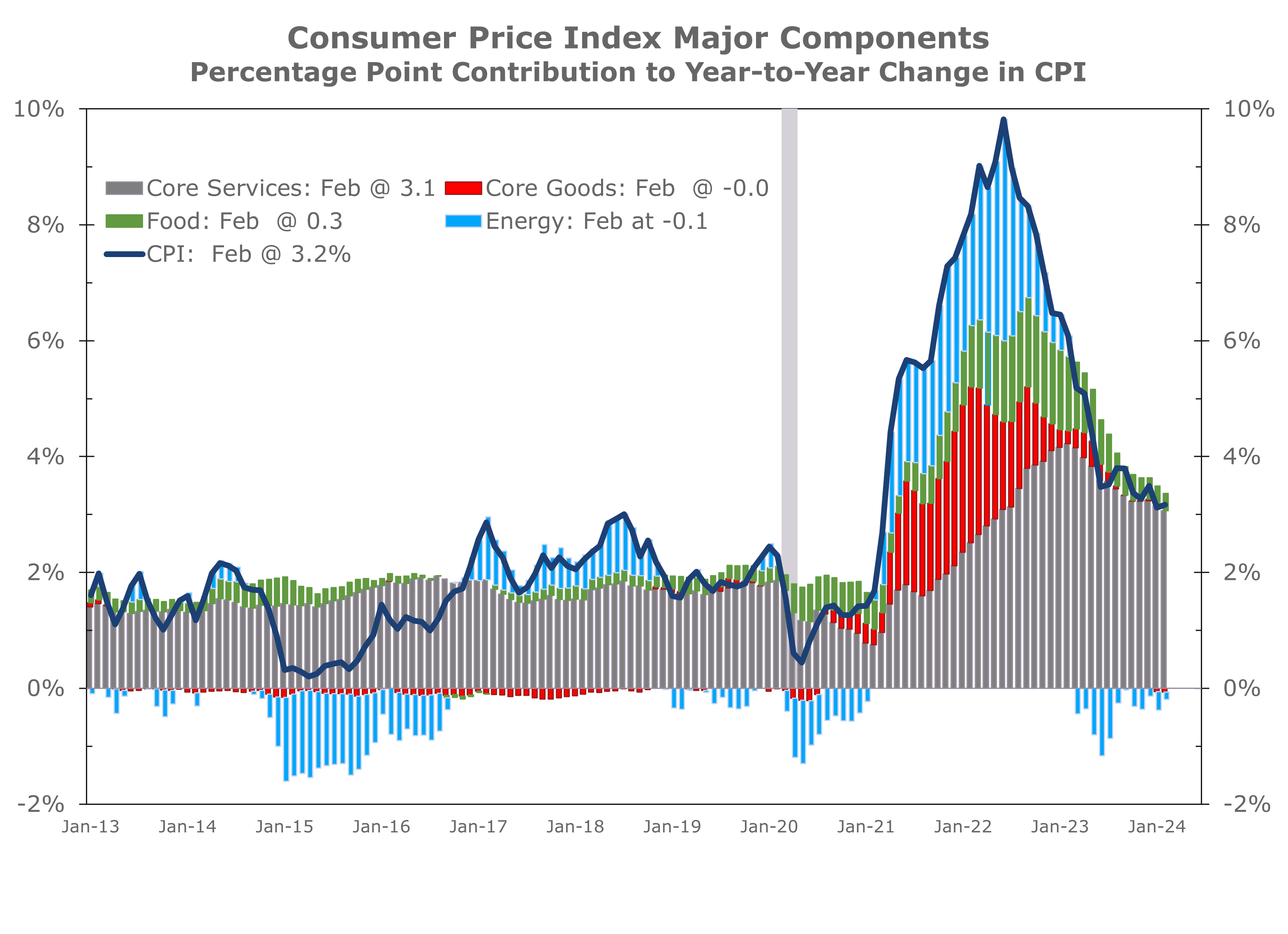 While inflation has remained more persistent than expected, it has slowed considerably since the Fed became more aggressive about hiking interest rates. The year-to-year change in the Consumer Price Index peaked out at 9.1% in June 2022 to just 3.2% in February of this year. Most of that improvement came from falling energy prices. Prices for used cars and SUVs also reversed much of the spike seen during the pandemic and food prices, which had risen sharply in 2021 and 2022, rose less rapidly this past year. Core services prices, which account for the bulk of consumer outlays, have moderated much less and now account for the bulk of overall inflation.