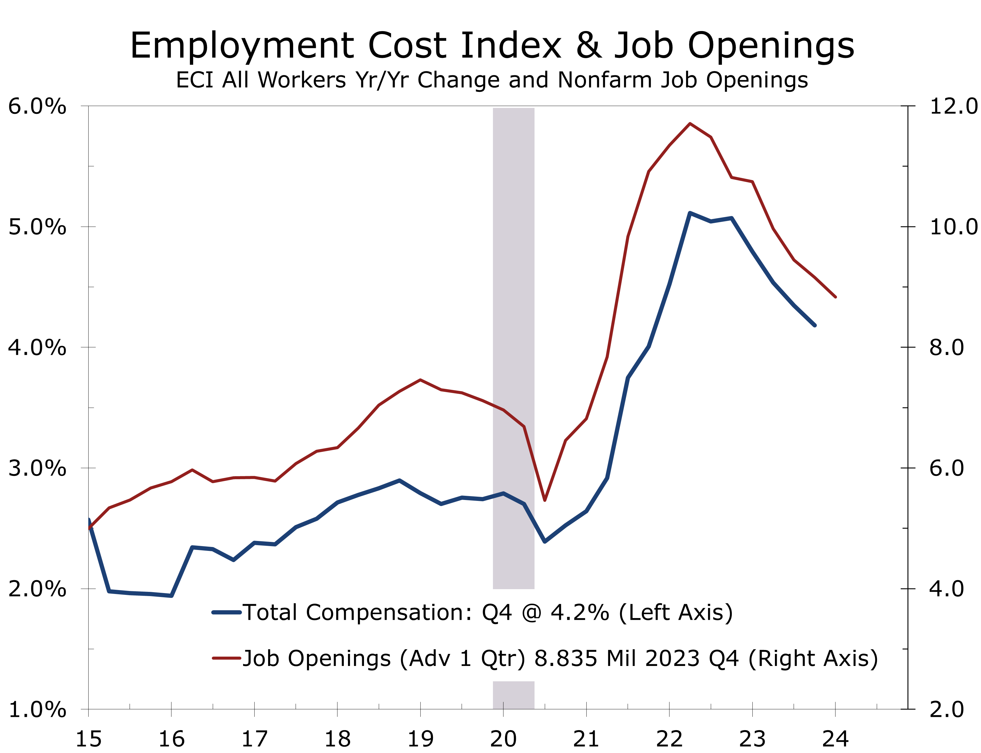 Core services inflation, excluding housing, remains problematic, surging 0.9% in January and rising 0.5% in February. Auto insurance and car repair have been a major part of the problem, but prices are up sharply in almost every industry where labor makes up a large proportion of costs. The focus on core services prices brings attention back to the labor market, where the number of job openings has cooled off considerably over the past 18 months. There is a pretty tight relationship between job openings and the Employment Cost Index (ECI), which is a broader measure of labor costs that includes benefits. We expect job openings to recede further this year, although the rate of deceleration is expected to slow somewhat. Much of the recent strength in job growth has been at state and local governments, health care, and the leisure hospitality sector, which are all striving to bring hiring back in line with their pre-pandemic trend.
