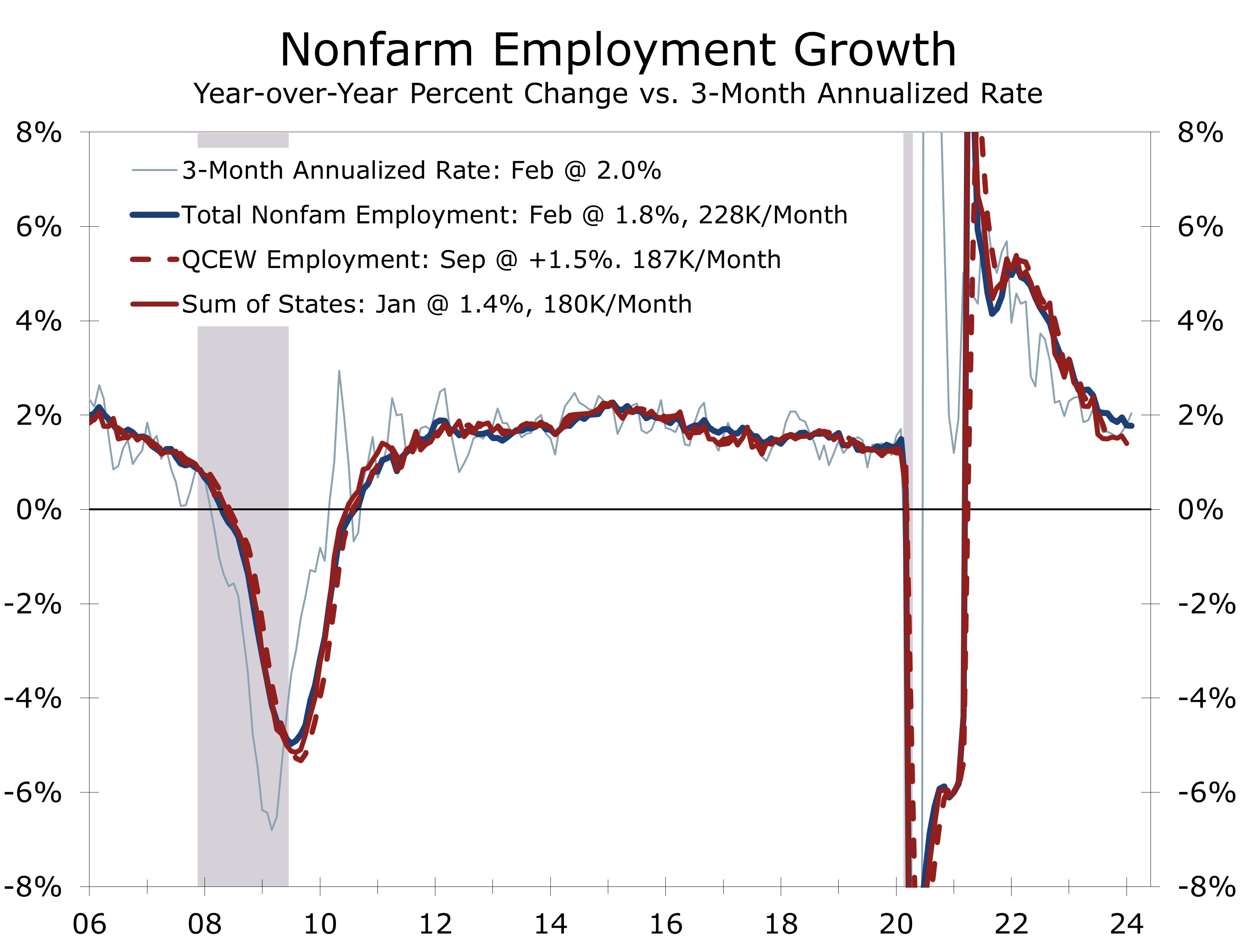 • The Federal Reserve is currently tracking multiple objectives. The principal target is long-term price stability, which means returning core inflation measures back to a 2% pace. The second is maintaining full employment, which means keeping the unemployment rate around 4% and maintaining high levels of labor force participation. A third objective is to avoid surprises and policy missteps, particularly ones that would lead to financial volatility. The Fed’s final objective is to accomplish all of this without becoming a political issue in this year’s election.