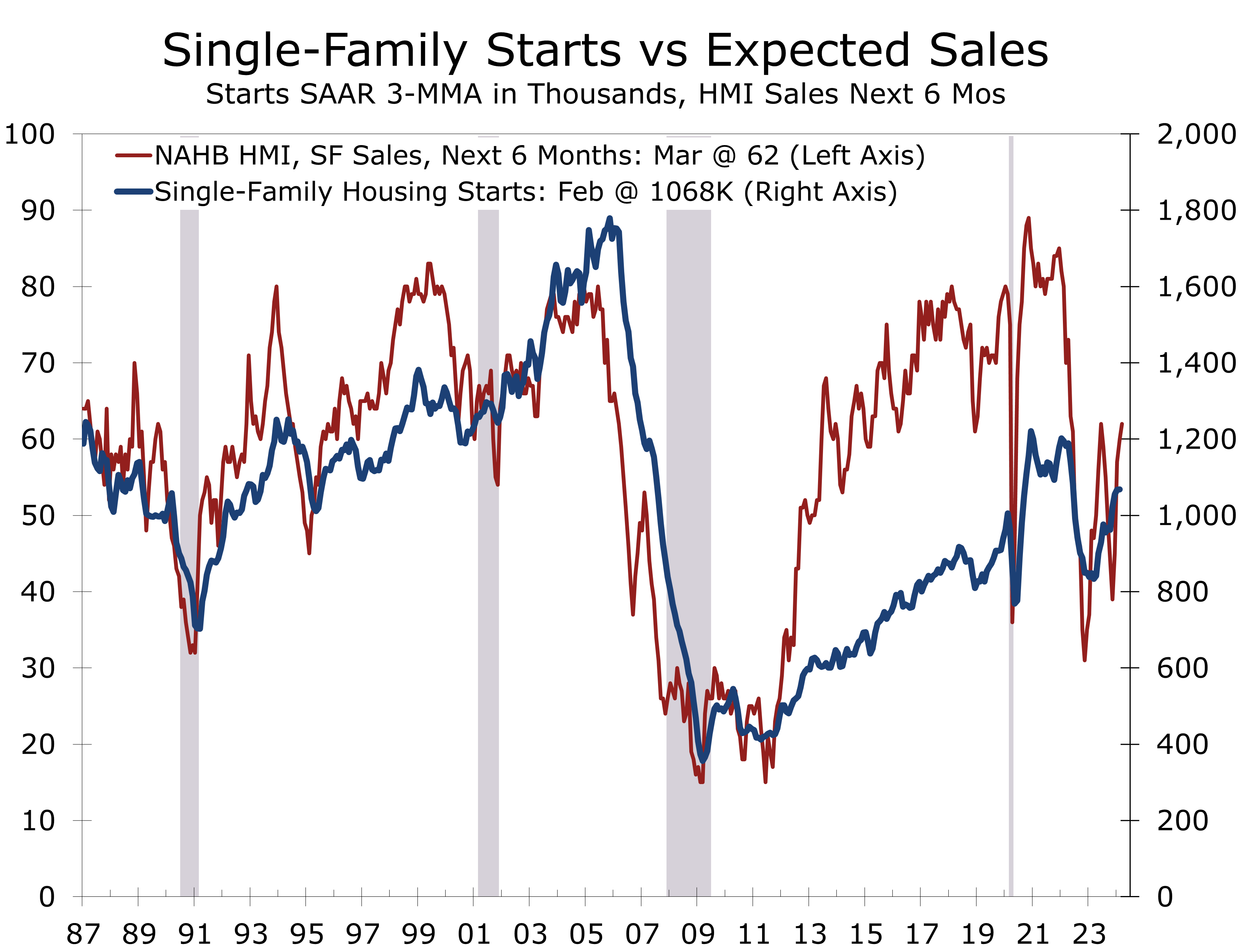 Home building is expected to be a significant driver of economic growth this year. Mortgage rates are projected to decline, with the rate for a 30-year conventional mortgage expect to fall to 6.50% by the end of the year. Home builders are extensively utilizing mortgage rate buydowns, resulting in a steady rise in buyer traffic. The NAHB/Wells Fargo National Housing Market Index (HMI) climbed 3 points in March to 51, marking its fourth consecutive increase and reaching its highest level since July of last year. Builder expectations for sales over the next 6 months also rose by 2 points to 62, matching their highest level in 21 months.