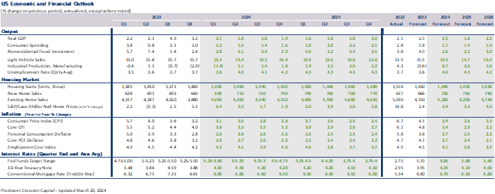 • We have made some slight adjustments to our forecast and see economic growth moderating this spring and summer. The Fed is expected to cut the federal funds rate by a quarter percentage point in June and follow that with cuts in September and December. We expect additional cuts in 2024 but do not believe the Fed is in any hurry to bring the federal funds rate back to neutral.