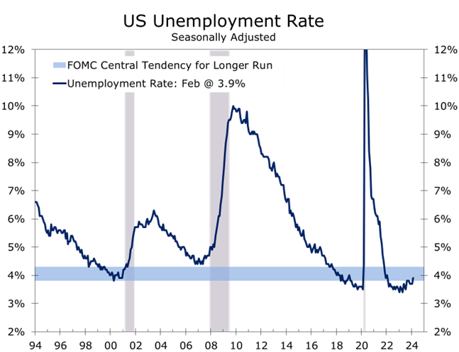 If job growth slows along the lines we expect, the Fed will more easily be able to justify cutting interest rates, even if inflation continues to prove resilient. Seasonal adjustment issues likely understated core inflation during the second half of 2023 and the payback for that is now boosting it. The Fed left themselves a little more room on this front by slightly lifting their expectation for core PCE inflation to 2.6% this year from 2.4%.