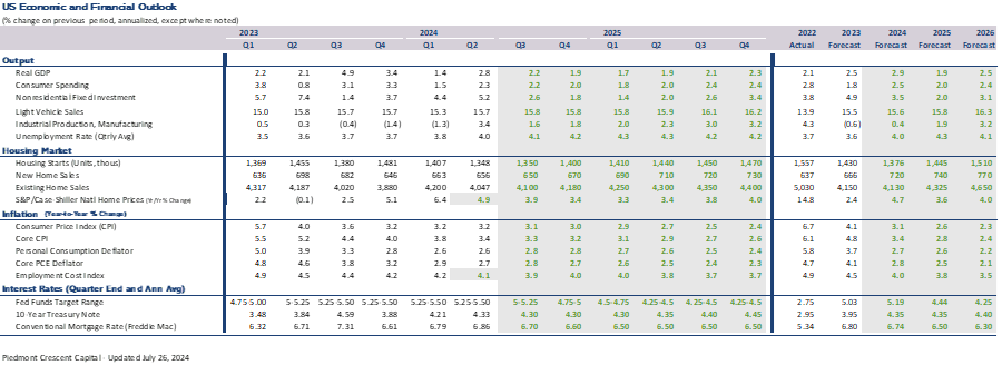 As for politics, the most likely outcome remains a republican sweep in November, although the odds have diminished somewhat due to Biden handing off the democratic nomination to Kamala Harris. Either way, we expect major stimulus programs such as the Inflation Reduction Act and Infrastructure Act to remain in place in 2025. The “Trump tax cut” will likely be extended.