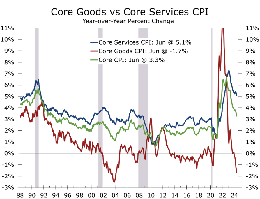 The core CPI has also moderated, rising just 0.1% in June and just 3.3% year-to-year. The core CPI peaked back in September 2022 at 6.1% and was just 2.4% before the pandemic. The moderation in price increases is broad-based. Airfares (-5.0%) and lodging (-2.0%) were two of the more notable price drops in June and are consistent with recent comments about the competitive price environment from Delta Airlines CEO Ed Bastian. Core goods prices were mixed. Prices for new vehicles fell 0.2%, while prices for used vehicles fell 1.5%. Prices for recreation goods rose 0.4%, with pet products rising 0.8%. Overall, core goods prices have fallen 1.7% over the past year, largely reflecting a 10.1% drop in used vehicle prices.
