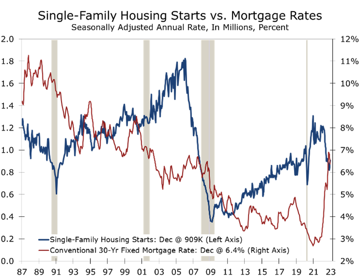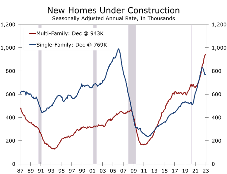 The divergence between starts and permits in the Northeast suggests December’s spike in housing starts will almost certainly be reversed next month. While that certainly takes some of the shine off today’s better-than -expected data, there are plenty of other encouraging aspects to December’s report. Single-family starts rose in the South and West, rising 4.4% and 6.7%, respectively. These two regions accounted for nearly 81% of all single-family starts in 2022.