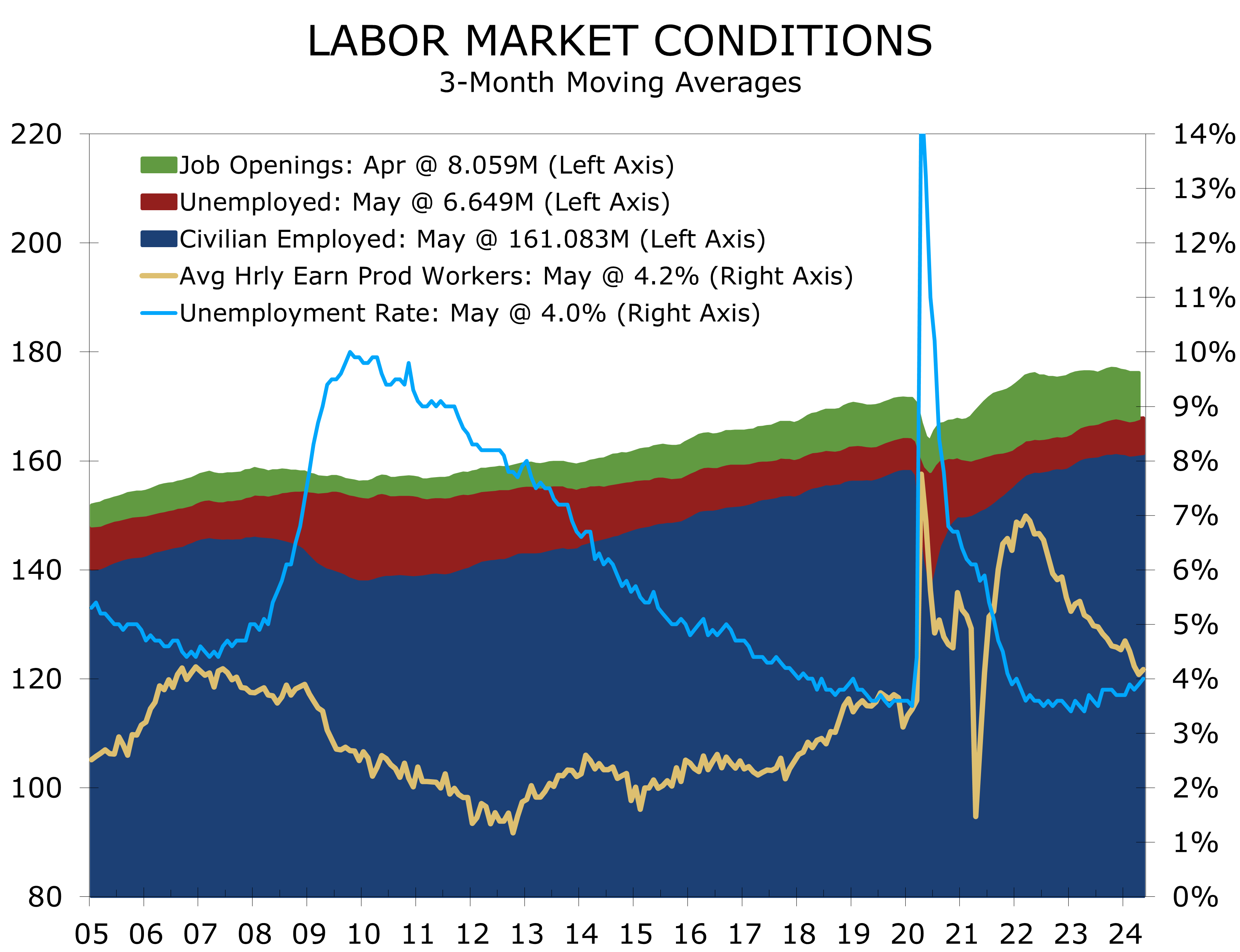 Despite the larger-than-expected rise in hourly earnings, the May employment report still shows the labor market gradually moving back into balance. An earlier report from payroll processor ADP showed overall hiring slowing, particularly at smaller firms. Job openings in the JOLTS survey also ticked lower in April, falling to their lowest level since February 2021. The unemployment rate edged higher, climbing 0.1 points to 4.0%, its highest level since January 2022.