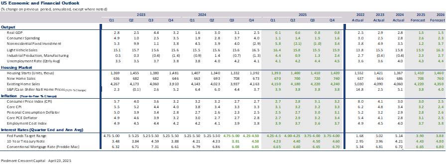 - The implementation of larger-than-expected tariffs has led the Federal Reserve and most private forecasters to sharply lower their projections for economic growth this year. The tariffs are not only higher and more broad-based than anticipated but are also now expected to be more enduring and more disruptive to both U.S. and global economic growth.