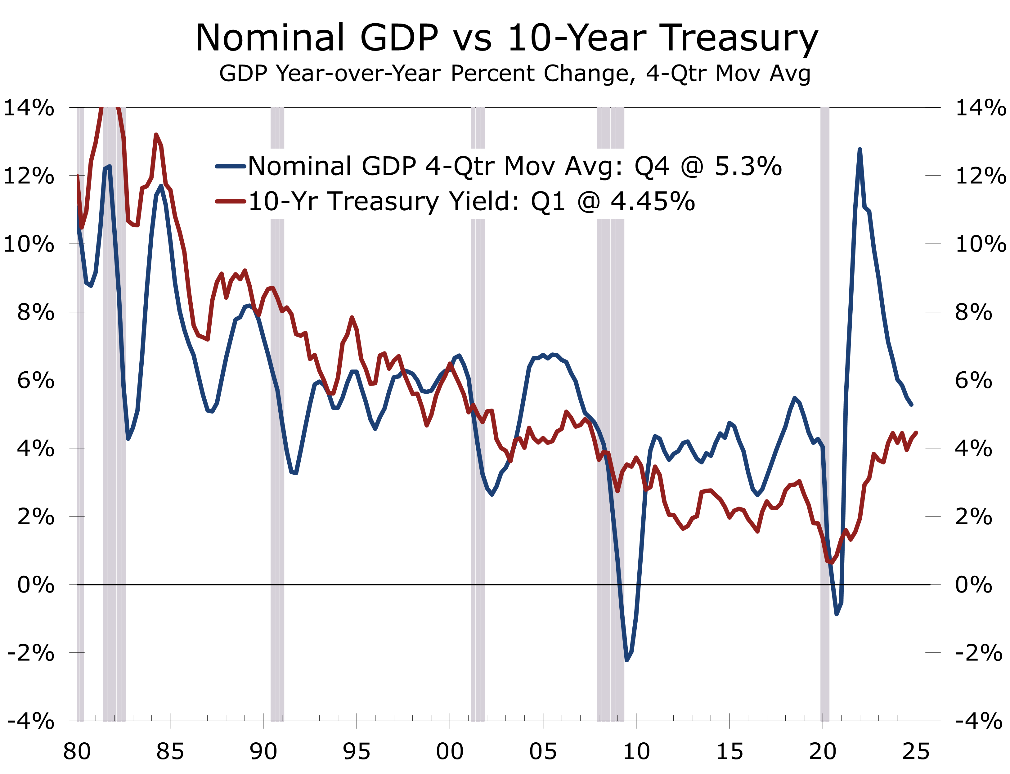 Today, a weaker dollar and rising Treasury yields suggest investors are bracing for lasting economic dislocations rather than a short-lived trade skirmish. Higher yields also reflect expectations of reduced foreign demand for Treasuries, as Trump’s tariff strategy aims to narrow the U.S. trade deficit, and capital reallocates toward emerging markets poised to absorb displaced production. Prior to the collapse of LTCM, the yield on the 10-Year Treasury Note consistently remained above nominal GDP growth – which would put it over 5.0% today.