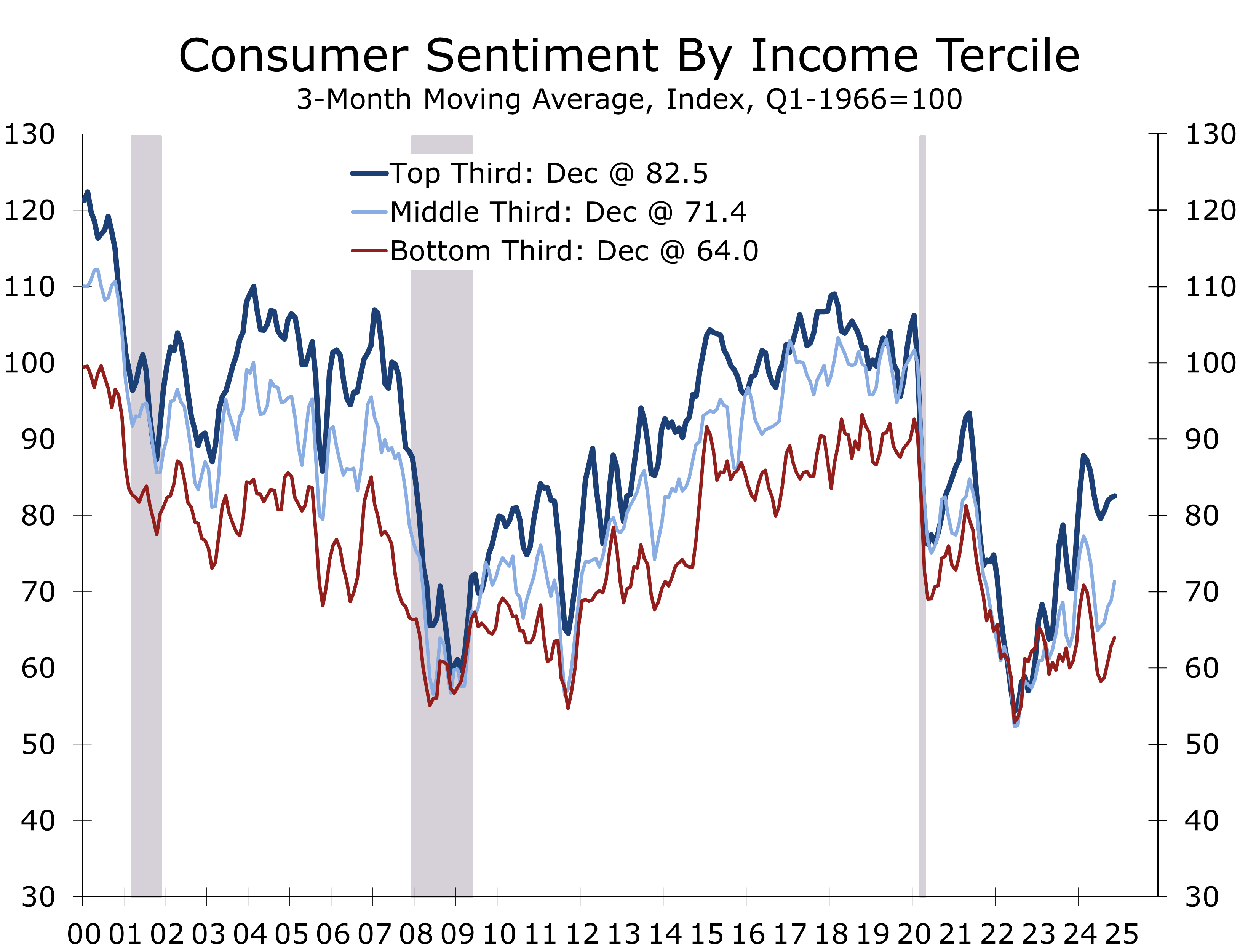 The University of Michigan’s consumer sentiment survey highlights particular weakness among lower-income households. Sentiment for the lowest income tercile has decreased to 64, matching the levels seen during the depths of the Global Financial Crisis. Middle-income households are only slightly more optimistic, with sentiment at 71.3. These figures suggest that economic uncertainty and rising costs are disproportionately affecting consumers with tighter budgets, posing a potential obstacle to discretionary spending.
