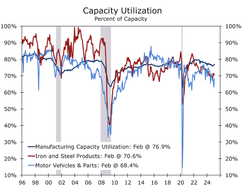 The Administration justifies the move on national security grounds and the need to bolster domestic manufacturing. The White House highlights a $93.5 billion auto parts trade deficit in 2024 and a shrinking industry workforce. By raising import costs, the policy aims to push consumers toward American-made vehicles and incentivize domestic production. A study cited by the administration suggests a global 10% tariff could significantly boost the U.S. economy and employment. There is some room to boost output. The Fed’s latest data show the U.S. auto industry operating at 68.4% of capacity, compared to a historical average of 74.9%. While domestic production should theoretically rise, the broader economic impact remains uncertain. The iron and steel industry is operating at 70.6% of capacity versus an historic average of around 78%.