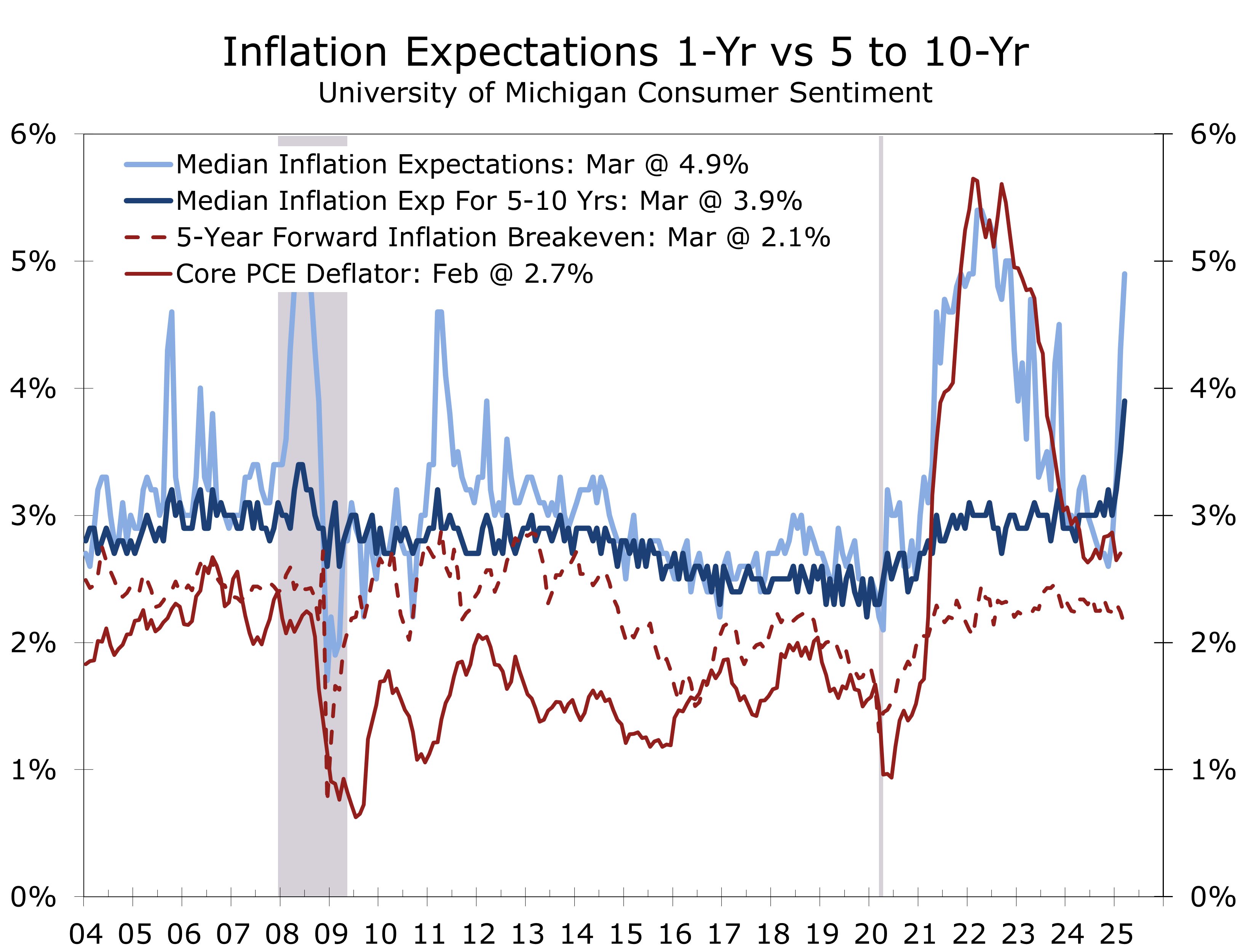 Federal Reserve officials, including Chair Jerome Powell, have acknowledged this divergence but prioritize market-based indicators. At his March 19, 2025, FOMC press conference, Powell dismissed the University of Michigan survey as an “outlier,” emphasizing that long-term inflation expectations remain well-anchored. The Fed views the inflationary impact of tariffs as a one-time shock rather than a sustained driver of inflation, reinforcing confidence that inflationary pressures will stay contained despite short-term consumer concerns.