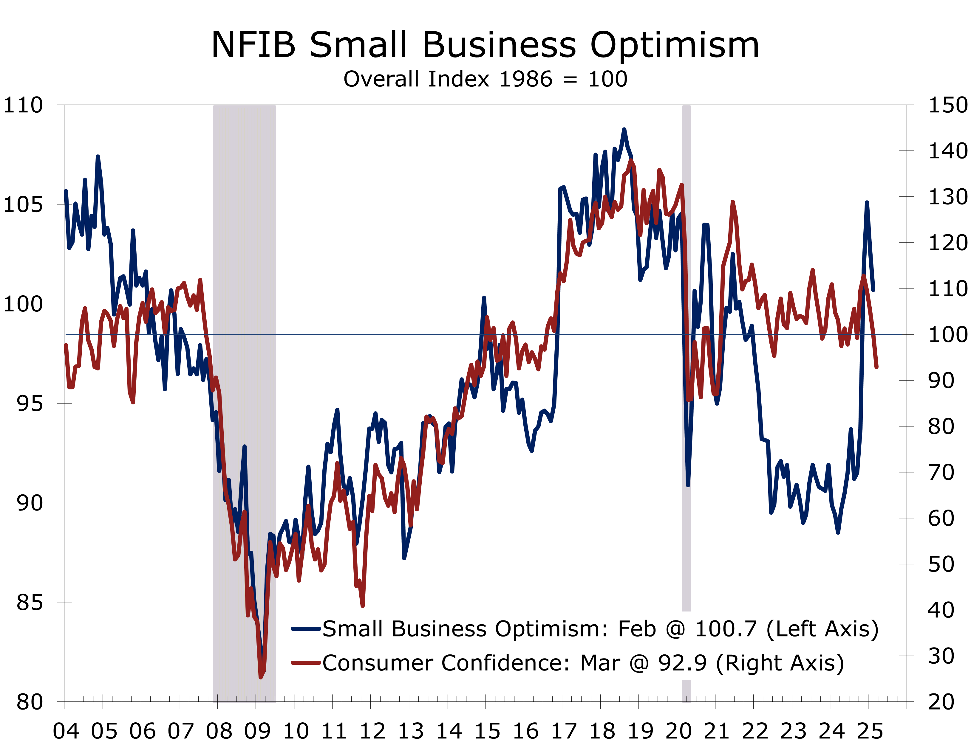 - Concerns over President Trump’s various tariff initiatives and efforts to reduced government spending have led to heightened uncertainty, which has weighed on consumer and business confidence. This has led businesses to increase imports, postpone investments, and reduce hiring, ultimately resulting in significantly lower forecast for GDP growth this year.