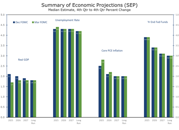 - The Federal Reserve’s initial assessment of President Trump’s tariff increases indicates that core PCE inflation is projected to rise 3.0% in 2025, a 0.5 percentage points faster than their previous forecast. Simultaneously, the median GDP growth estimate for 2025 was lowered by 0.4 percentage points to 1.7%. Chair Powell also made note of heightened uncertainty apparent in the economy today, and implied that the Fed would proceed cautiously.