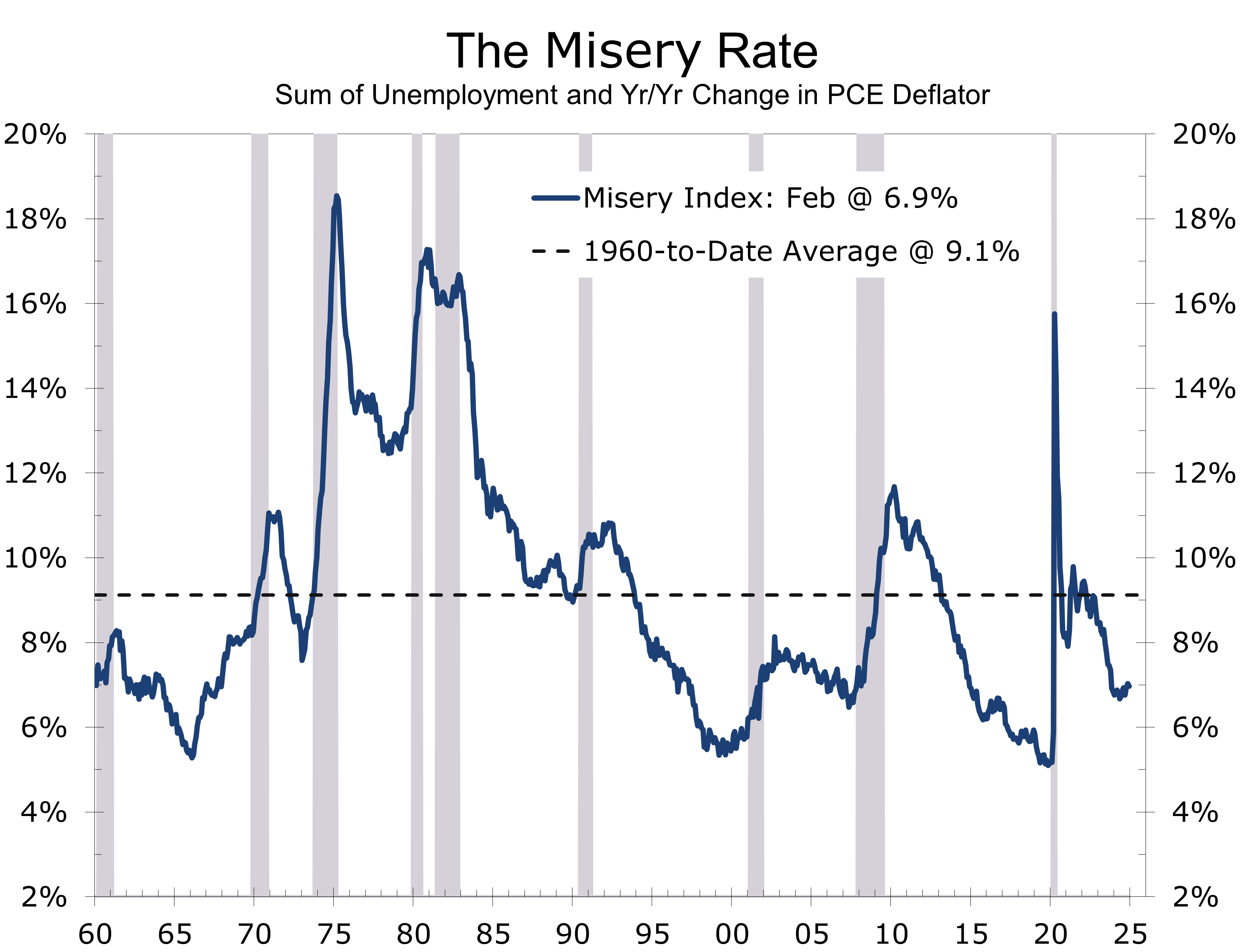 The Misery Index, which combines inflation and unemployment, provides a useful gauge of stagflation risk. At 6.9%, it is still well below the 8.3% threshold. Even with our forecast of unemployment rising to 4.4% and core PCE inflation reaching 3.0% by year-end, the Misery Index would only rise to 7.4%. By contrast, during the stagflationary periods of the 1970s and early 1980s, the Misery Index routinely exceeded the high teens due to exceptionally loose monetary policy and major demographic shifts, particularly the influx of baby boomers and women into the workforce. Today’s inflationary pressures stem from more temporary factors—tariffs, supply chain disruptions, and fading pandemic stimulus.