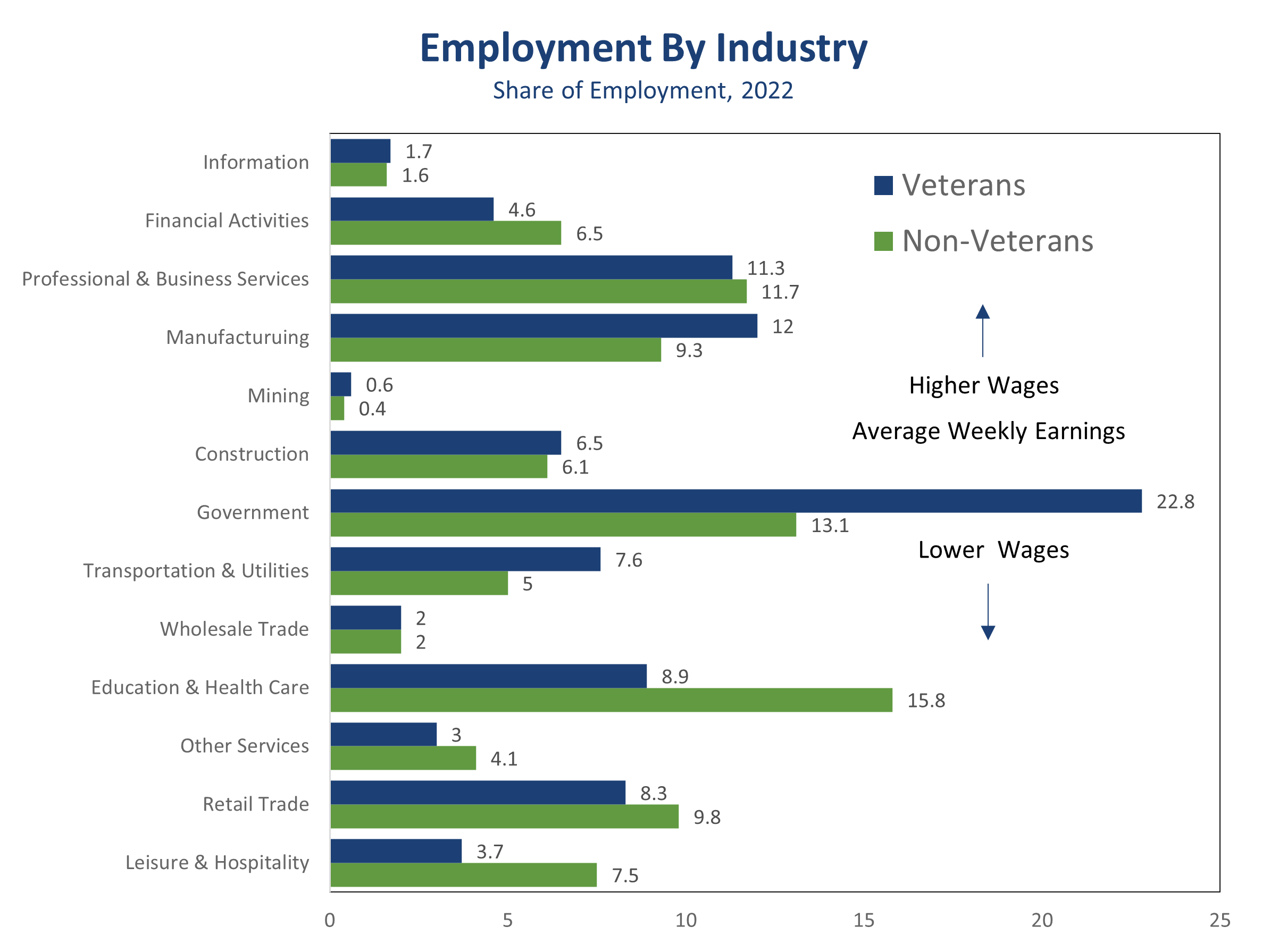 One thing all four states have in common is that the federal government is a major employer in the state. Veterans are much more likely to work for the federal government than nonveterans, with 10.8% of veterans working for the federal government in 2022, more than five times more than nonveterans (2.1%).