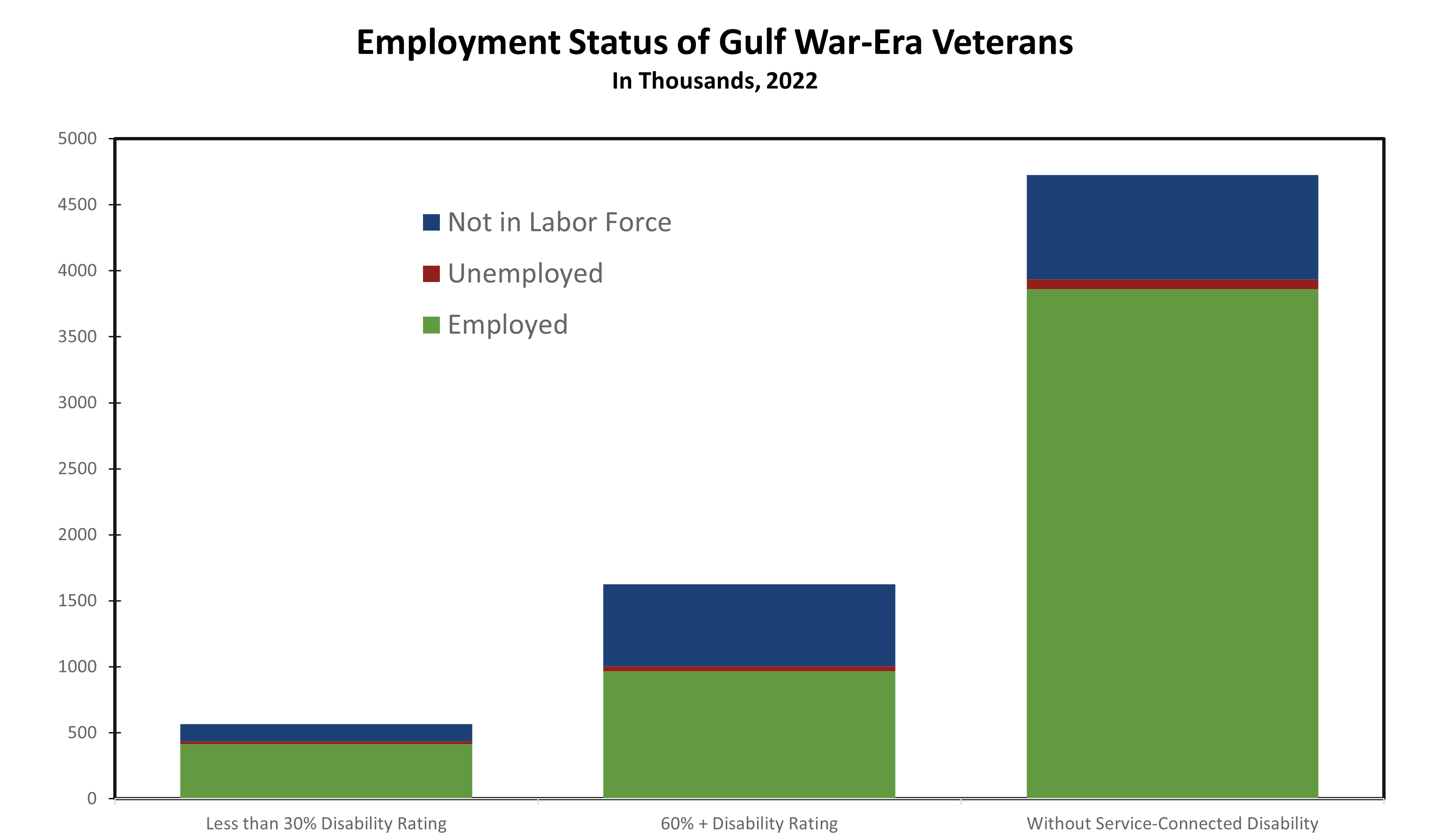 Labor force participation for veterans with a disability rating of less than 30% is roughly equivalent to that of veterans overall, at around 77%, but well below the share of Gulf-War-era veterans without a service-connected disability (83.3%). The unemployment rate for Gulf War-era veterans with a service-connected disability is 3.6%, which is notably higher than for Gulf War-era veterans without a disability (1.9%).  Gulf War-era veterans with a disability rating of less than 30% have a higher unemployment rate (4.7%) than those with veterans with a disability rating above 60%, which was 4%. The reason for the lower unemployment rate is that a larger share of veterans with a disability rating of 60% or more are not in the labor force.