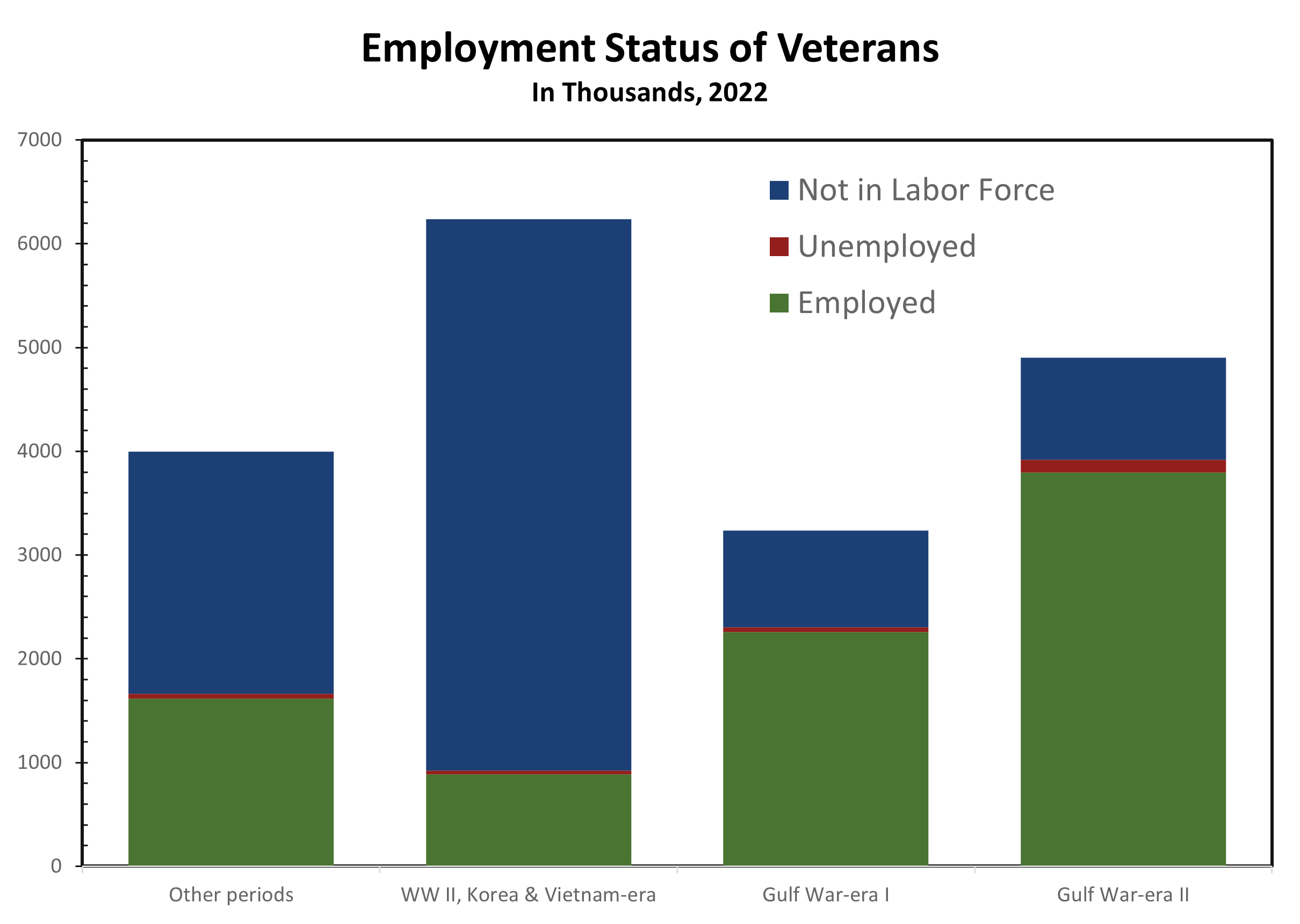 Demographics also explain a large part of the lower unemployment rate. This largely reflects the still large population of World War II, Korean War and Vietnam-era Vets, which numbered just over 6.2 million in 2022, all of which are age 65 or over. Most Vets from this era are no longer in the workforce, and many have retired to warmer climates that have an abundance of military facilities that can be used by Vets. With so many veterans out of the workforce, the overall labor force participation rate, which is the proportion of the civilian population that is either working of looking for work (47.9%), is nearly 17 points lower than it is for nonveterans.