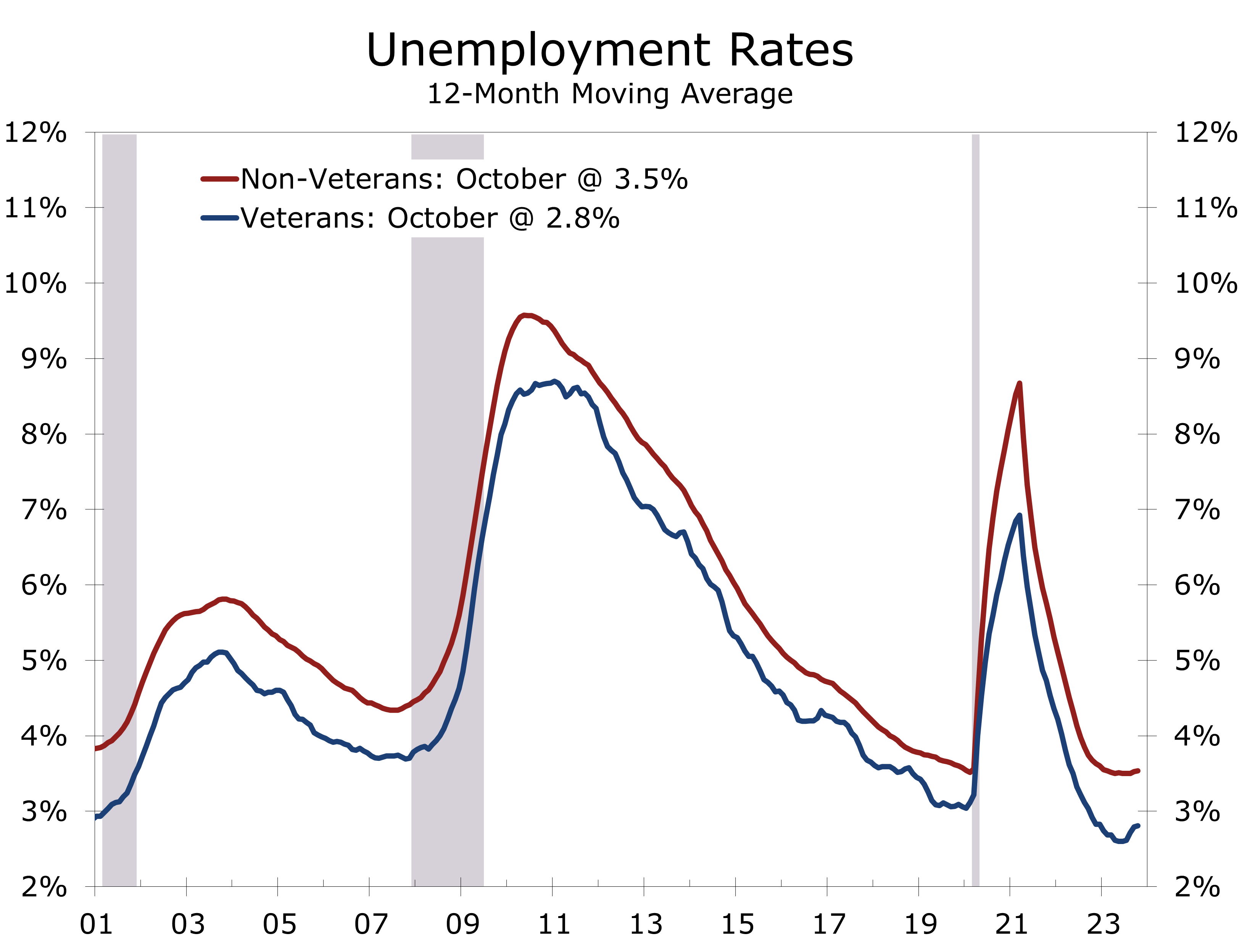 • Veterans have consistently experienced an unemployment rate approximately one percentage point lower than the non-military population. The gap tends to narrow as the labor market tightens. Wages and salaries for prime-working age male veterans are roughly even with men who have not served, while female veterans earn about 12% more than non-military women.