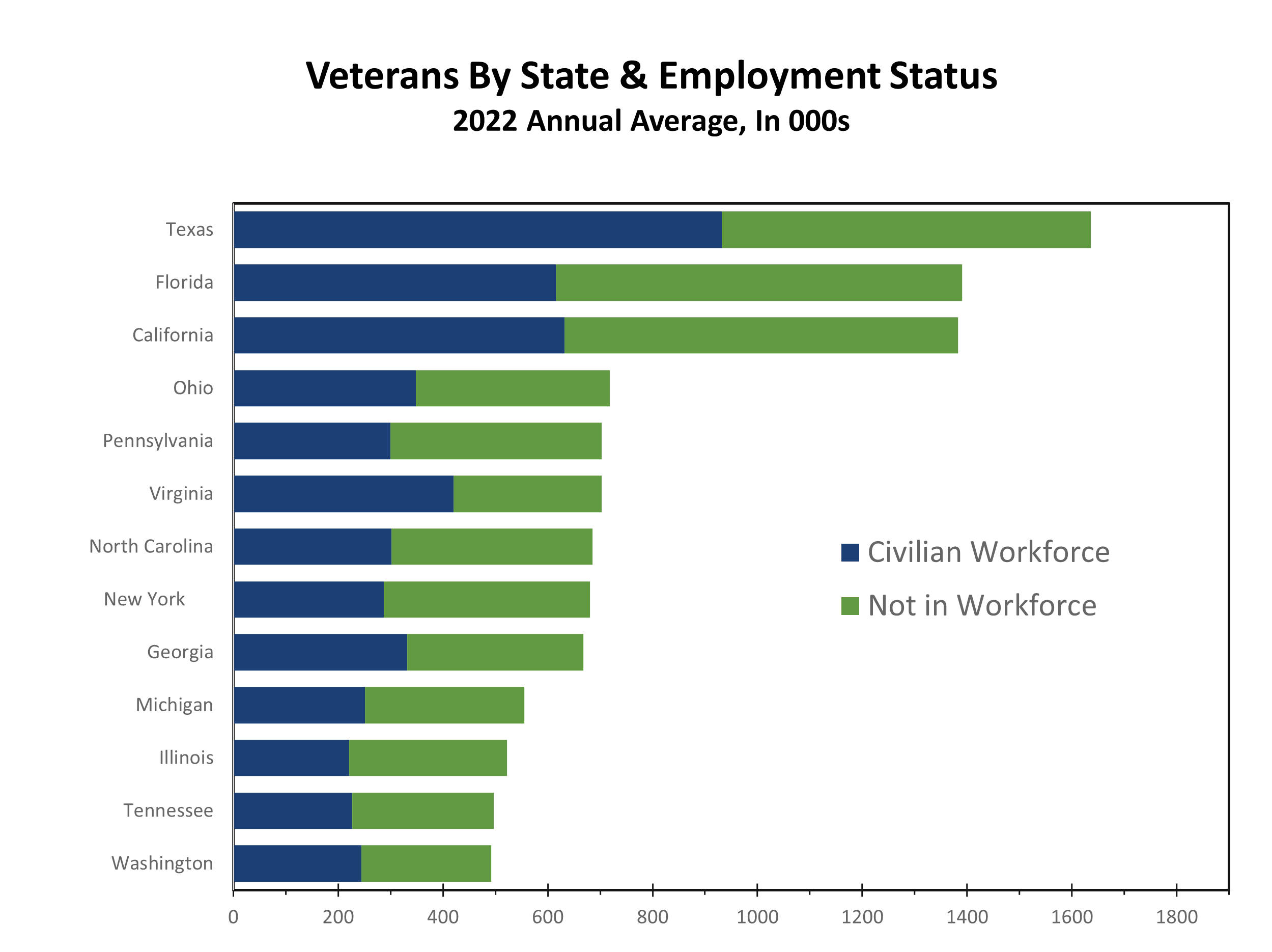 • Given the higher median age of veterans, a large proportion are retired and out of the workforce. A disproportionate share of these retirees resides in states that are home to a large military presence, including Florida, Texas, California, Georgia, Virginia, and the Carolinas.