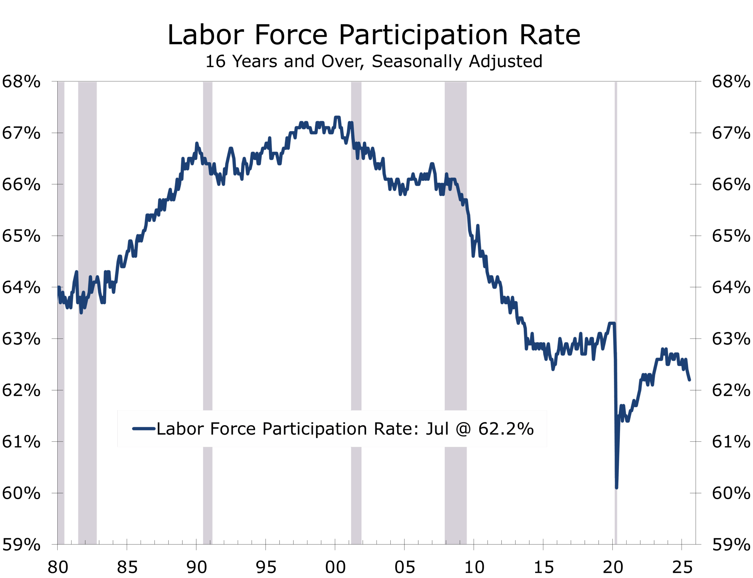 - The unemployment rate rose to 4.2%, but labor force participation fell to 62.2%, the lowest since the pandemic recovery.
