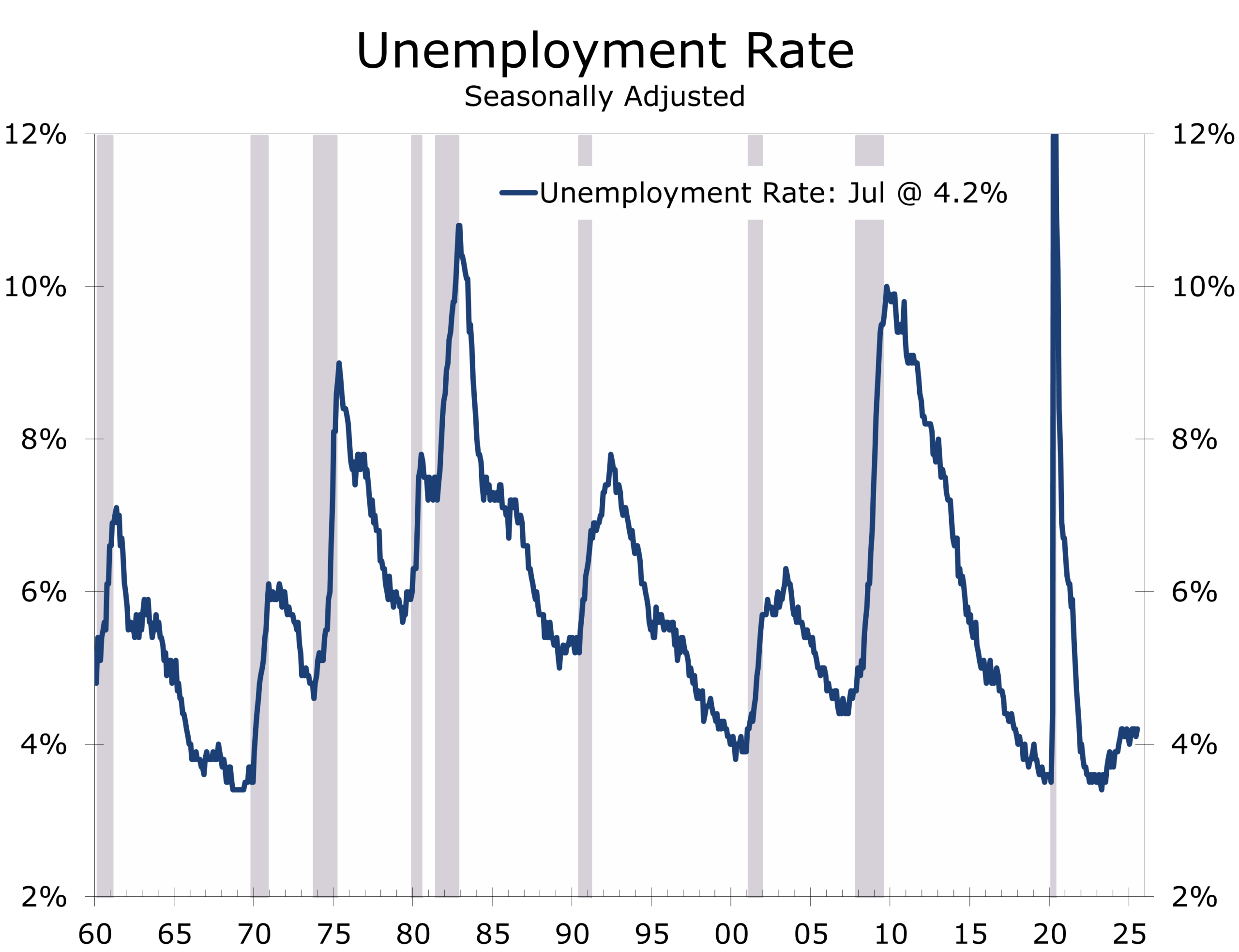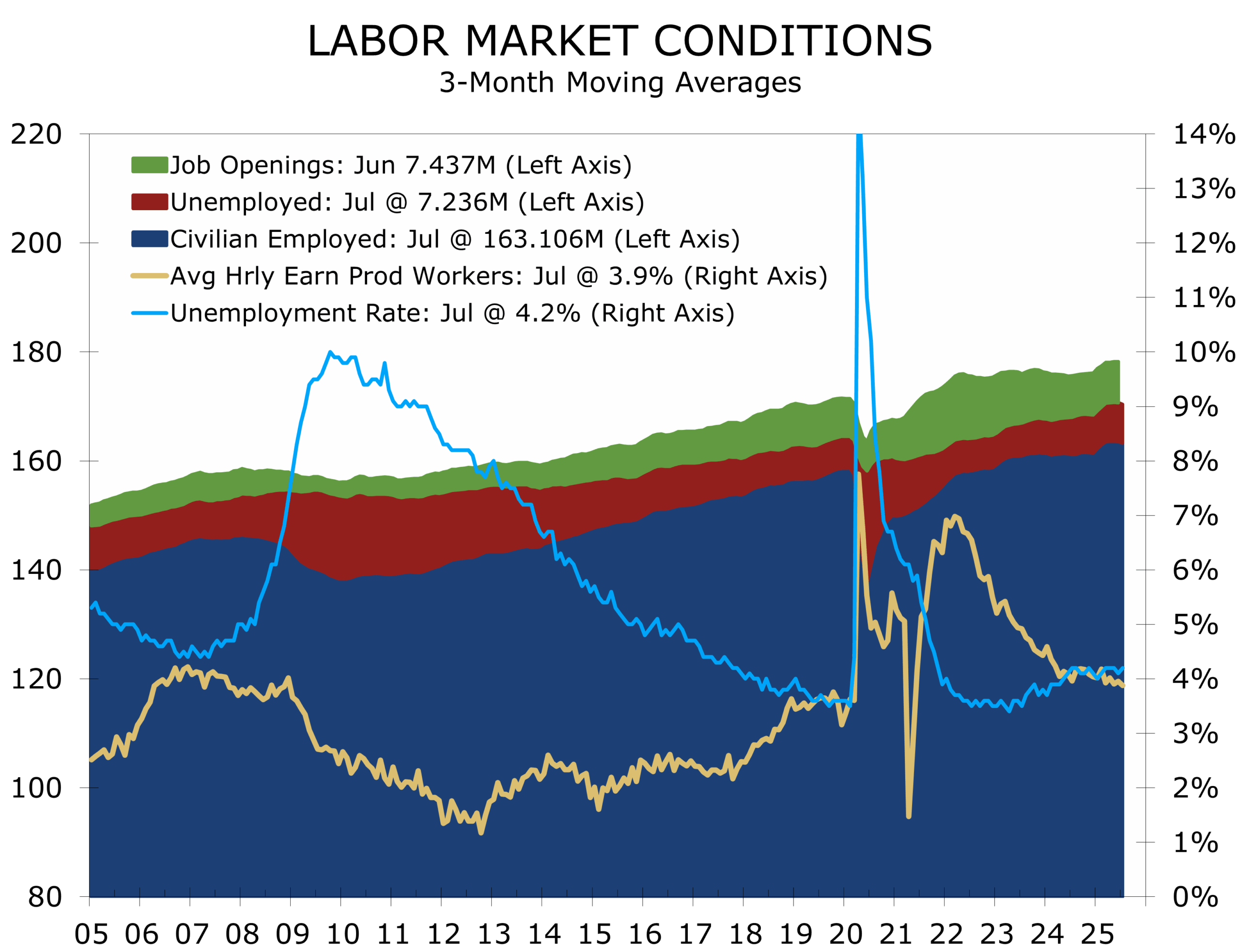 The drag from policy uncertainty is growing. President Trump’s latest tariffs—imposed just ahead of a August 1 deadline—have added a 35% duty on Canadian imports and expanded duties on dozens of trading partners. Businesses are reacting with hiring freezes and greater selectivity. Temporary help, retail, and tech services remain weak. The previously reported stability in the factory sector also looks suspect, with revised data showing a bit more weakness.