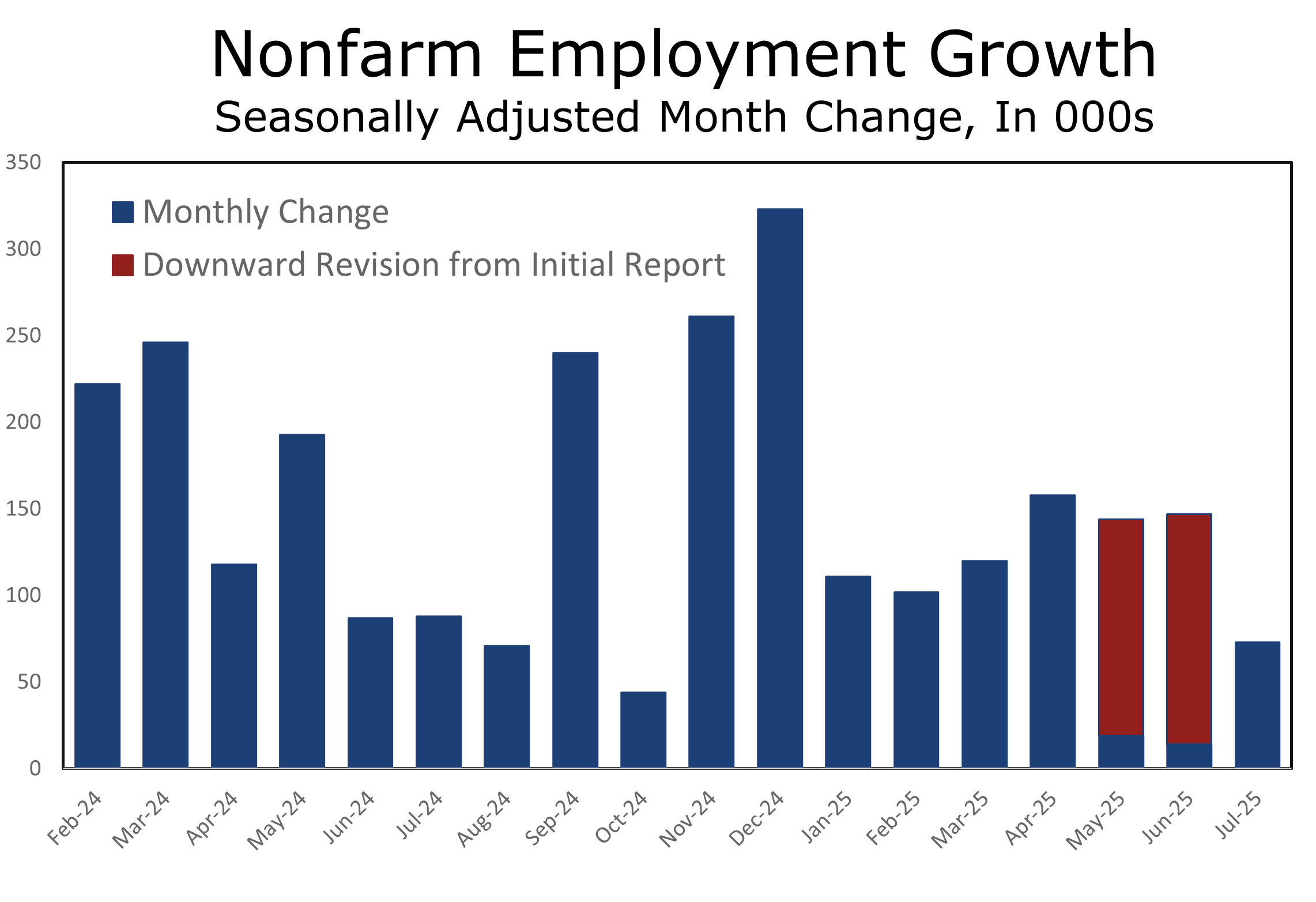 - Nonfarm payrolls rose just 73,000 in July, with steep downward revisions of 258,000 to May and June. The three-month average now stands at just 35,000.