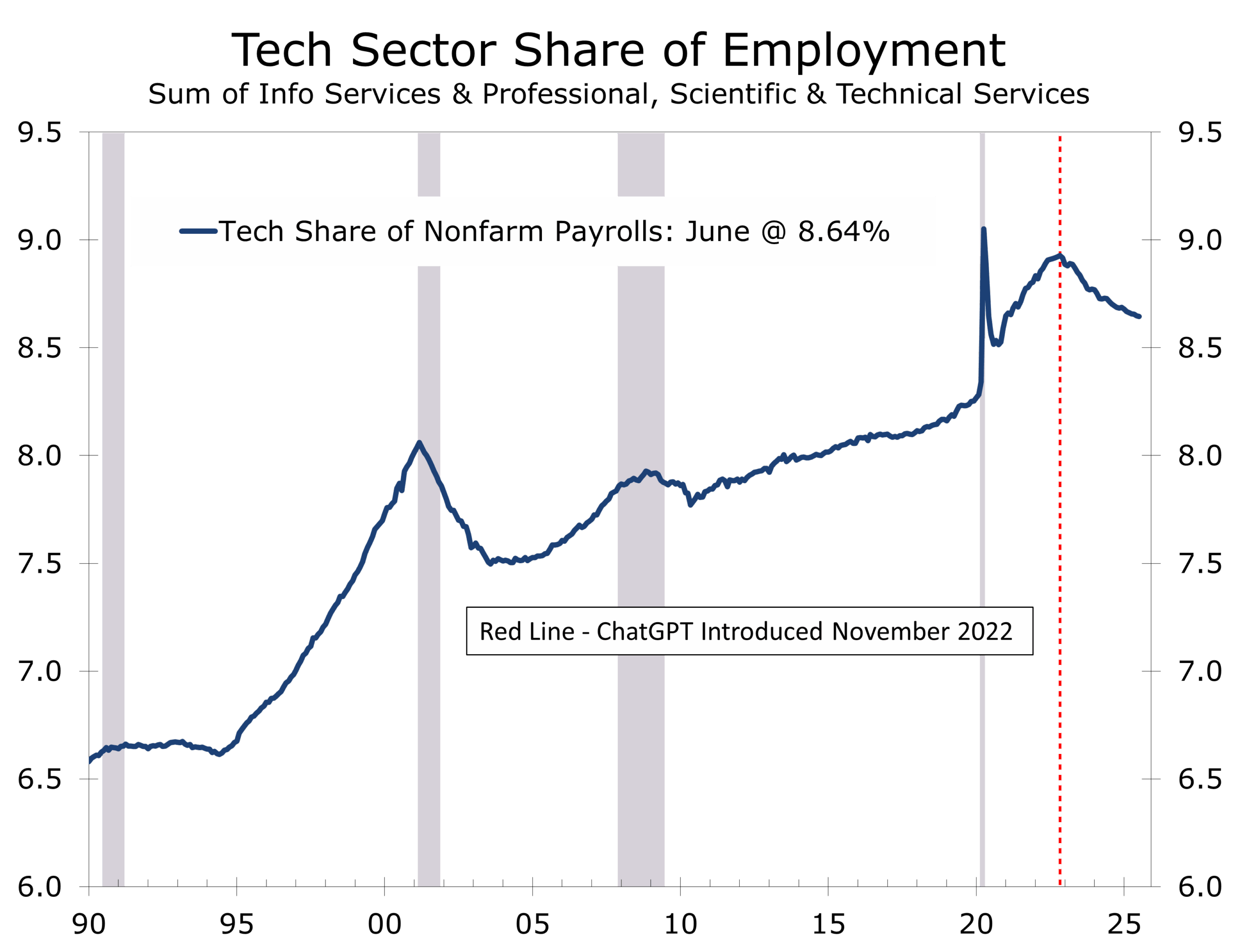 The household survey showed a net loss of 260,000 jobs in July. Long-term unemployment rose by 179,000 to 1.8 million—the highest since early 2022—and now accounts for nearly a quarter of the total unemployed, a troubling indicator historically tied to weakening labor demand and emerging AI-related displacement. Tech’s share of employment has declined since the launch of ChatGPT in November 2022. A narrow subset of tech-related roles we track within information and professional and technical services has now fallen for seven consecutive months, losing 12,300 jobs in July and 33,200 over the past three months.